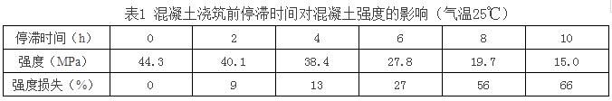 (6)在初凝時間內(nèi)的混凝土,由于氣溫較高、運(yùn)距較遠(yuǎn)、壓車時間較長等造成混凝土坍落度損失較大,可通過試驗添加同型號的泵送劑或減水劑,但添加與原先已加的總和摻量不能超過外加劑最大摻量的20%。應(yīng)逐漸添加,先少加,摻入后,攪拌運(yùn)輸車必須快速轉(zhuǎn)動2min左右,測定坍落度符合要求。運(yùn)到現(xiàn)場的混凝土不能立即卸料,應(yīng)快速轉(zhuǎn)動運(yùn)輸車2min后卸料,以確保坍落度和質(zhì)量。對超過初凝時間的混凝土應(yīng)廢棄,不能再使用。混凝土澆筑前停滯的時間越長,混凝土強(qiáng)度損失越嚴(yán)重(如表1),應(yīng)當(dāng)引起足夠重視。