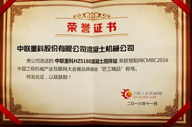 中聯重科HZSE180/HZS180產品4.0攪拌站榮獲CMIIC2016中國工程機械產業互聯網大會“匠工精品”稱號,這標志著中聯重科4.0攪拌站產品得到了行業的充分認可。