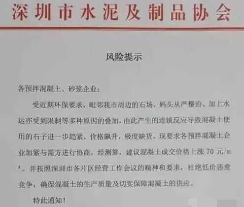 調價函表示,近段時間,受毗鄰周邊石場,碼頭管治,加上水運受到一定限制等多種因素影響,導致珠三角周邊地區礫石極度緊缺直接影響價格成本上漲,造成混凝土生產直接成本增加70元/立方以上,混凝土公司已無力承擔由于原材料價格急劇上漲造成的巨額虧損,為確保混凝土的正常供應,從2016年12月13日起,在實際結算價的基礎上上調70元/立方(以C30為準,其他等級同比調整)。