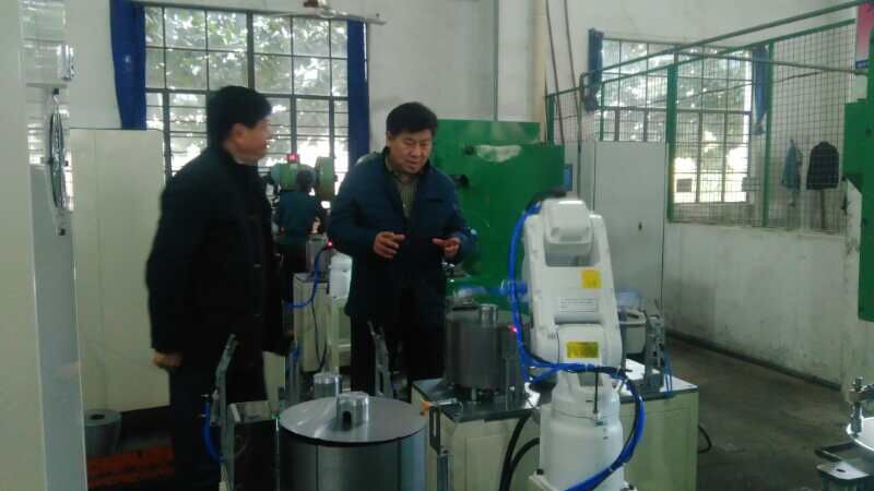走出會議室,孫總和胡部長陪同符會長一行參觀公司生產車間,走到機加車間,符會長一下子就被“機器人操作完成錐形電機定子沖槽工作”工位所吸引,孫總講,這個工位以前都是人工操作,勞動強度很大,現在正在全力推進工位機器人操作,不久將會全部用機器人替代。