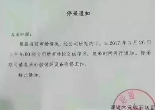 湖南常沅砂石聯盟近日發布停采通知,自2017年3月26日上午8:00起,該公司所有標段全線停采砂石,復采時間待定。這停采了,砂石供應可咋辦呢?