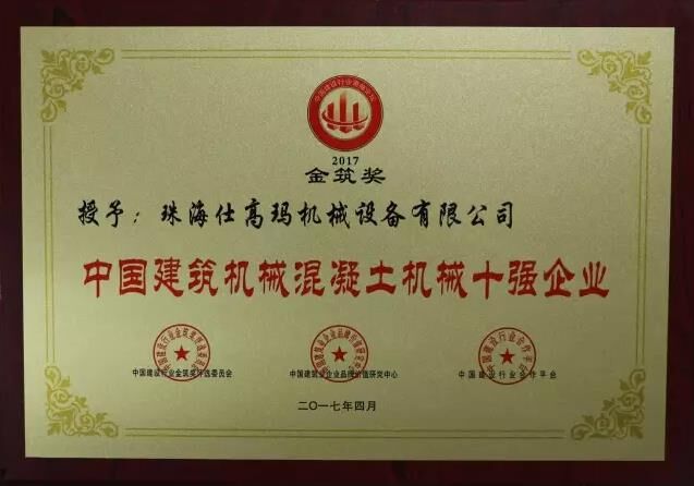 近日,“2017中國建設行業領袖峰會”暨2016年度“金筑獎”頒獎盛典在北京召開,珠海仕高瑪機械設備有限公司在2016年全國建筑業“金筑獎”評選活動中,榮獲“中國建筑機械50強”、“中國建筑機械混凝土機械十強企業”稱號。
