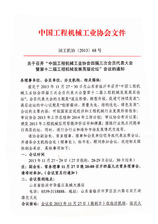 關于召開“中國工程機械工業協會四屆三次會員代表大會”會議的通知