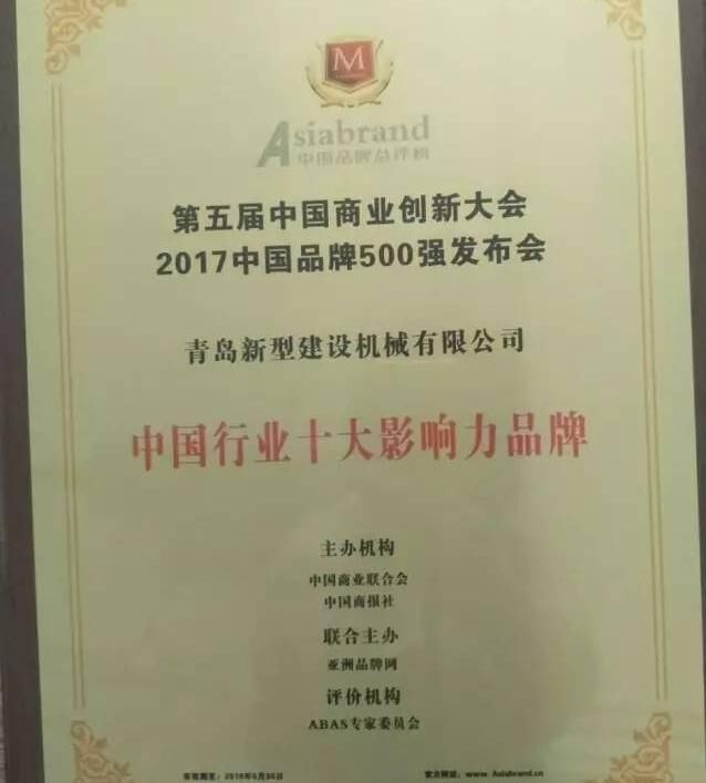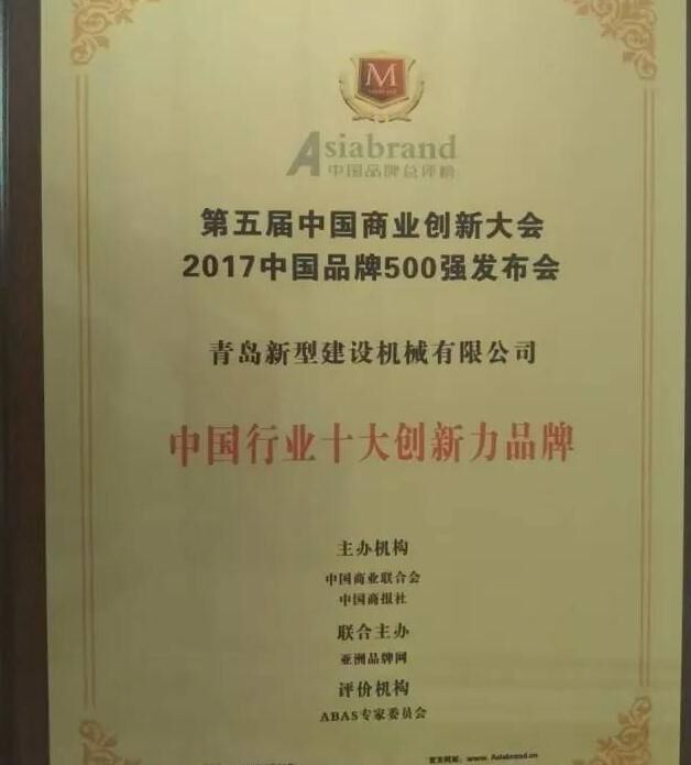 2017年5月31日,以“新品牌、新供給、新未來”為主題的第五屆中國商業創新大會暨2017中國品牌500強發布會在北京國家會議中心隆重舉行。建筑機械行業知名企業中青林集團旗下青島新型建設機械有限公司受邀參會,一舉榮獲“中國行業十大創新力品牌”與“中國行業十大影響力品牌”。