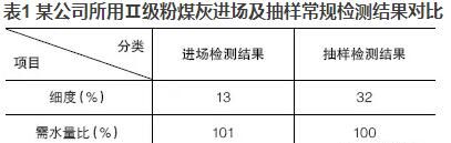 優質的粉煤灰摻入混凝土可明顯地改善混凝土的和易性,當粉煤灰摻量大于膠材總量的5%~10%時,效果極為明顯?,F今在混凝土實際生產中,粉煤灰摻量往往達到20%,有的甚至高達30%,但混凝土的和易性卻不盡人意。抽取原材料進行檢測時,發現粉煤灰的檢測結果經常不滿足標準要求或者與驗收時的結果相差甚遠?,F以某公司所用Ⅱ級粉煤灰進場及抽樣常規檢測結果進行對比,見表1。
