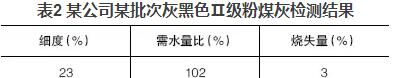 混凝土公司大多數使用的粉煤灰顏色與水泥相近,多呈灰色;也有部分粉煤灰顏色較深呈灰黑色,這種粉煤灰一般細度較細或含碳量較高。但總會發現一些深顏色的粉煤灰檢測結果與常理不符,如某公司某批次灰黑色Ⅱ級粉煤灰檢測結果見表2。