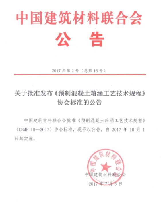 2017年7月,由中國混凝土與水泥制品協會(以下簡稱協會)組織制定的《預制混凝土箱涵工藝技術規程》和《混凝土用氧化鎂膨脹劑》兩項協會標準,通過審定并發布批準公告,標準號分別為CBMF 18-2017和CBMF 19-2017,將同時于2017年10月1日起實施。這是國務院《深化標準化工作改革方案》(國發[2015]13號)及質檢總局、國家標準委《關于培育和發展團體標準的指導意見》(國質檢標聯[2016]109號)發布后,協會與中國建筑材料聯合會(以下簡稱聯合會)聯合發布的首批協會標準,兩項標準將公開出版并發行。