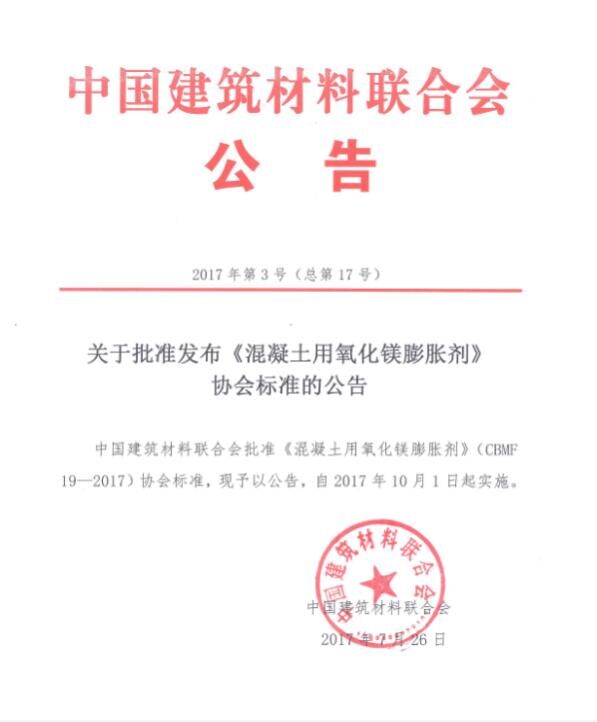 摘要:2017年7月,由中國混凝土與水泥制品協會(以下簡稱協會)組織制定的《預制混凝土箱涵工藝技術規程》和《混凝土用氧化鎂膨脹劑》兩項協會標準,通過審定并發布批準公告,標準號分別為CBMF 18-2017和CBMF 19-2017,將同時于2017年10月1日起實施。
