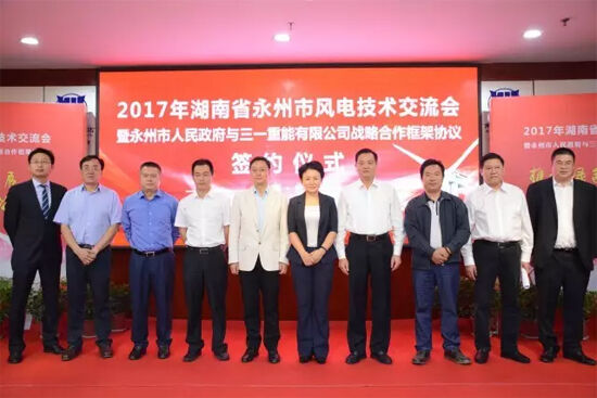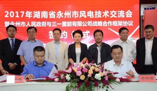 10月11日上午,三一重能與永州市人民政府簽訂了戰略合作框架協議,雙方將在風電開發、風電項目投資和裝備制造等方面展開深度合作。簽約儀式前,還召開了永州市風電技術交流會,交流風電新技術,對接三一重能,共商永州風電產業發展大計。