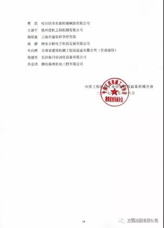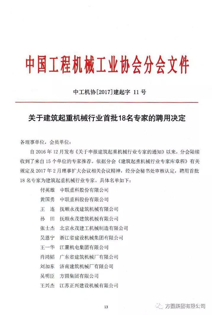 在11月9日召開的中國工程機械工業協會建筑起重機械分會年會上,以中工機協【2017】建起字11號文件公布了《關于建筑起重機械行業首批18名專家的聘用決定》,聘用首批18名專家為建筑起重機械行業專家,方圓集團副總工程師吳明臣名列其中。