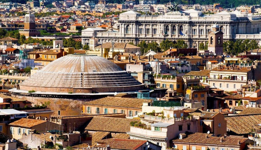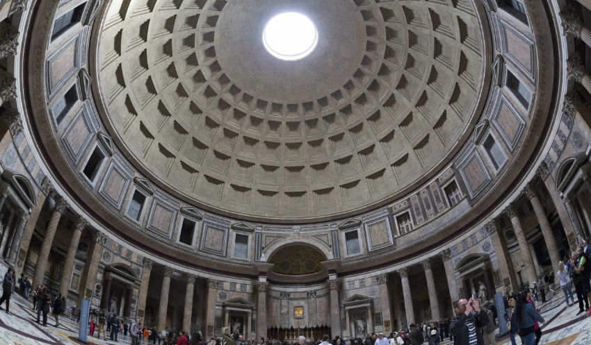此廟始建于公元前27年,后遭毀,約公元118年在哈德良皇帝時期重建。 由水泥澆鑄成圓形,上覆半球形穹隆頂,直徑43米。萬神廟采用了穹頂覆蓋的集中式形制,重建后的萬神廟是單一空間、集中式構圖的建筑物的代表,它也是羅馬穹頂技術的最高代表。
