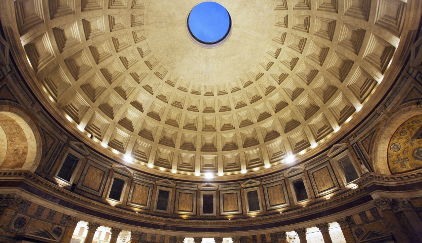穹頂頂部的矢高和直徑一樣,也是43.3米,這樣,萬神殿的剖面恰好可以容得下一個整圓,而它的內部墻面兩層分割也接近于黃金分割,因此它常被作為通過幾何形式達到構圖和諧的古代實例。