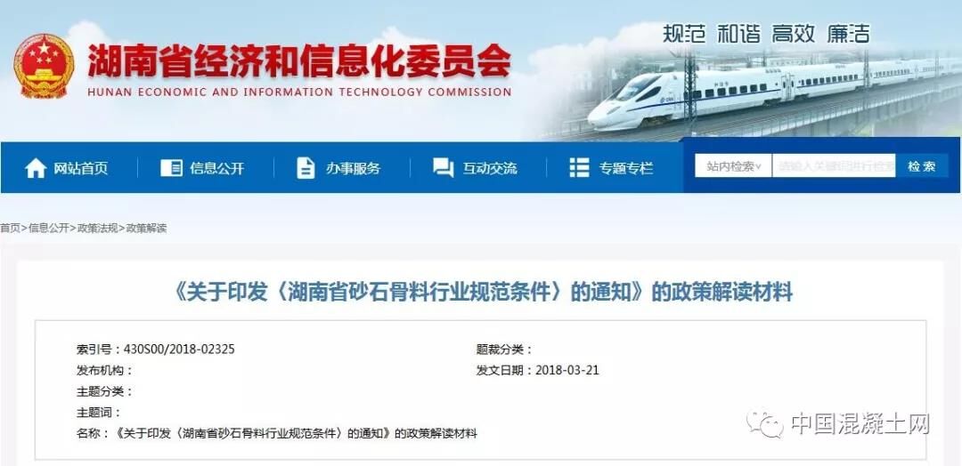 2018年3月2日,湖南省經信委《關于印發〈湖南省砂石骨料行業規范條件〉的通知》(湘經信原材料[2018]10號,以下簡稱《規范條件》)。該《規范條件》作為全省規范性文件已報省人民政府登記,經省政府法制辦審查并依法登記,統一登記號:HNPR—2018—05001。