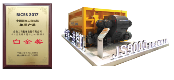 2017 BICES展上其憑借完美的外觀設計、無油軸端密封技術、雙料門結構、軸端密封檢測技術、混凝土溫度及塌落度在線檢測裝置等多項核心專利技術獲得行業的認同、用戶的認可,相信在后續的使用中,JS9000水工型混凝土攪拌主機必將承擔重任,大放異彩!