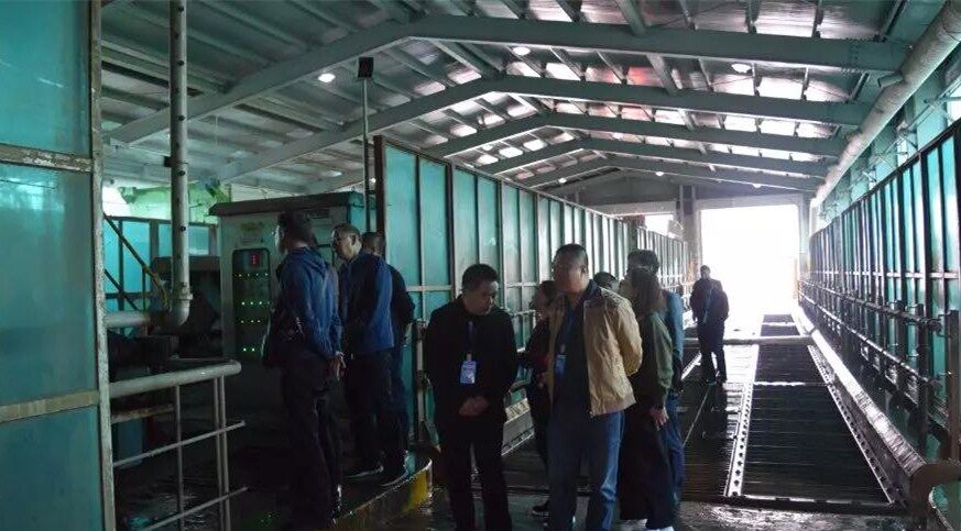 10日下午考察團(tuán)一行到達(dá)韓國最大的垃圾填埋廠,首先參觀生活食品垃圾運(yùn)輸車輛沖洗設(shè)備,此套設(shè)備由兩組車輛沖洗線構(gòu)成,每條線長度為50米,當(dāng)車輛駛?cè)胫粮袘?yīng)區(qū)設(shè)備自動啟動對車輛全方位立體式?jīng)_洗,沖洗中掉落的異物經(jīng)特制排泥裝置送至中央皮帶輸送機(jī)。車輛完成沖洗后駛出前對車身噴淋消毒去異味藥劑,最后烘干后離開。每日完成一千車次的清洗消毒工作。