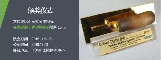 其中,亞洲金鏝刀獎報名已于2018年9月30日截止、已在緊張評選中,并將于2018年11月20日在上海新國際博覽中心舉辦的亞洲混凝土世界博覽會上隆重公布獲獎名單并舉行頒獎儀式;獲獎者還將受邀參加于2019年1月22-25日期間在美國拉斯維加斯會展中心舉辦的美國混凝土世界博覽會。