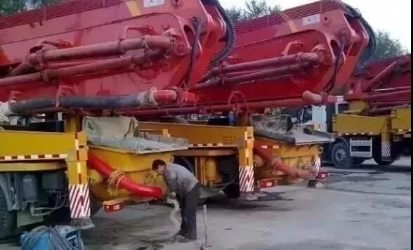 五、當(dāng)布料桿處于全部伸出并支固,不能移動車身。作業(yè)中需要移動時,應(yīng)將上段布料桿折疊固定,移動速度不超過10KM/h。布料桿不得使用超過規(guī)定直徑的配管,裝接的軟管應(yīng)系防安全繩帶。
