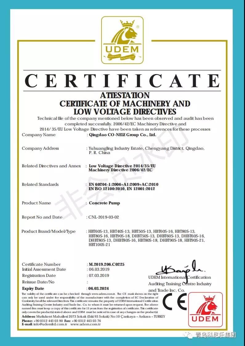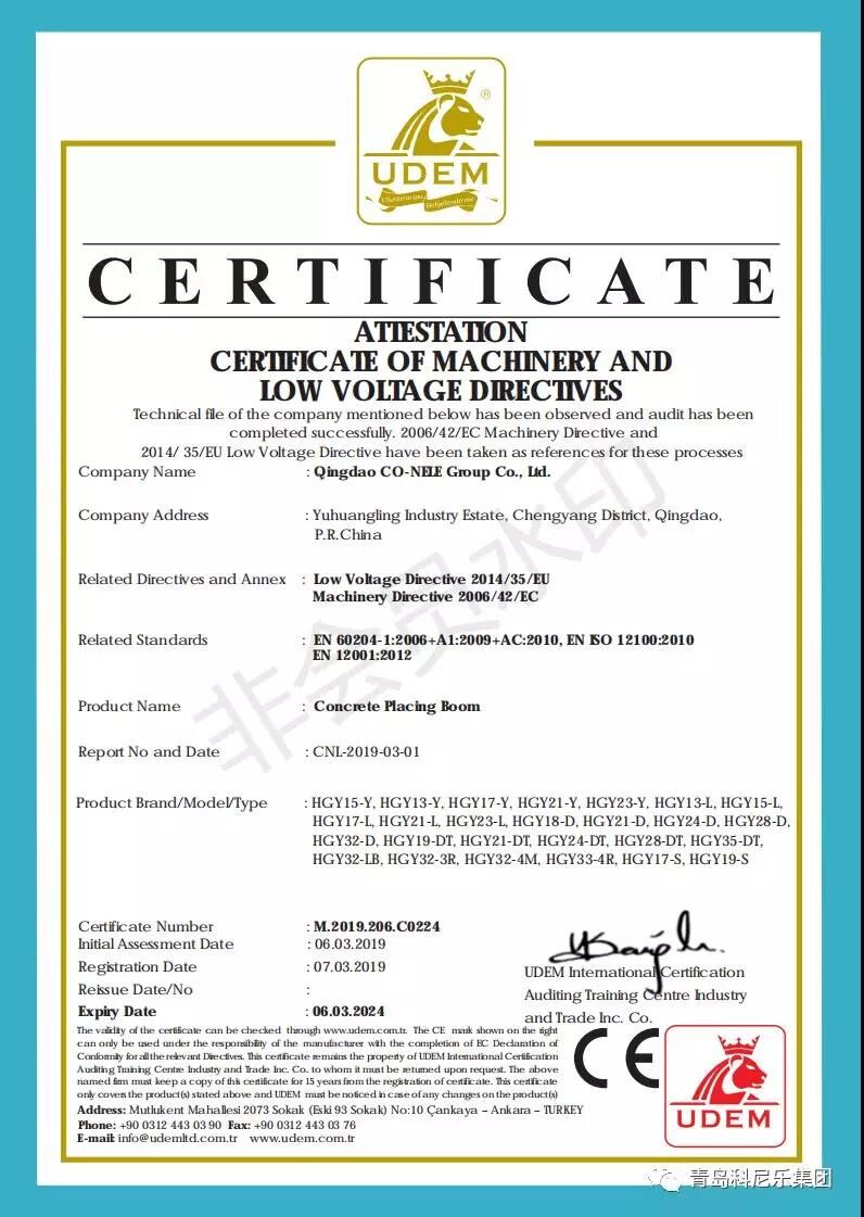 陽春三月,微風(fēng)習(xí)習(xí),科尼樂集團(tuán)的明星產(chǎn)品混凝土泵、混凝土布料機(jī)順利通過了歐盟CE認(rèn)證,這也代表著科尼樂集團(tuán)在提升產(chǎn)品品質(zhì)、拓展銷路、提升企業(yè)競爭力方面邁入了新臺階。