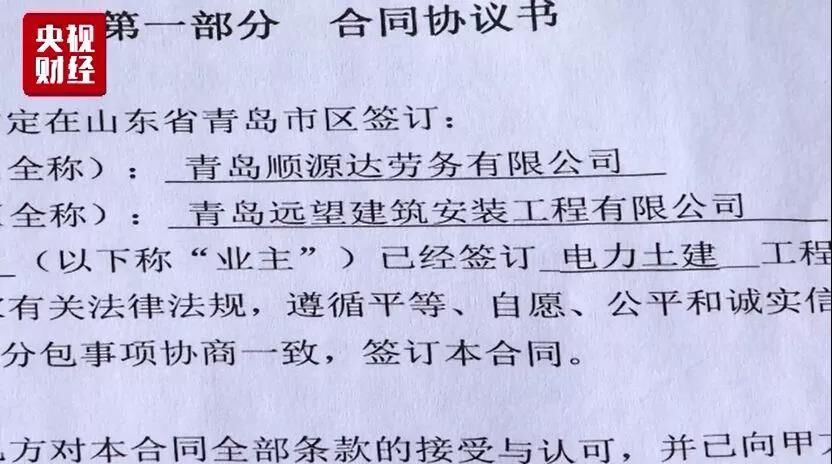劉飛云介紹,該標段總承包方為中國葛洲壩集團電力有限責任公司,總承包方通過青島永利捷電力工程有限公司、青島順源達勞務有限公司等層層分包,最終由他所在的青島遠望建筑安裝工程有限公司實際施工。