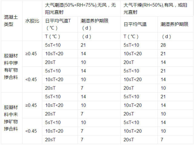 不同混凝土潮濕養護的最低期限