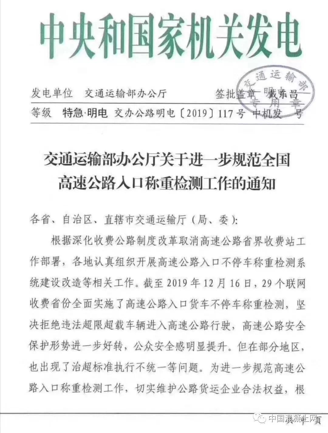 12月17日,交通運輸部辦公廳發布特急文件《關于進一步規范全國調整公路入口稱重檢測工作的通知》(交辦公路明電【2019】117號)(以下簡稱“《通知》”)。《通知》直指全國部分地區治超標準不統一的問題。為進一步規范高速公路入口稱重檢測工作,切實維護公路貨運企業合法權益,根據相關法律法規和規定,有關通知如下:
