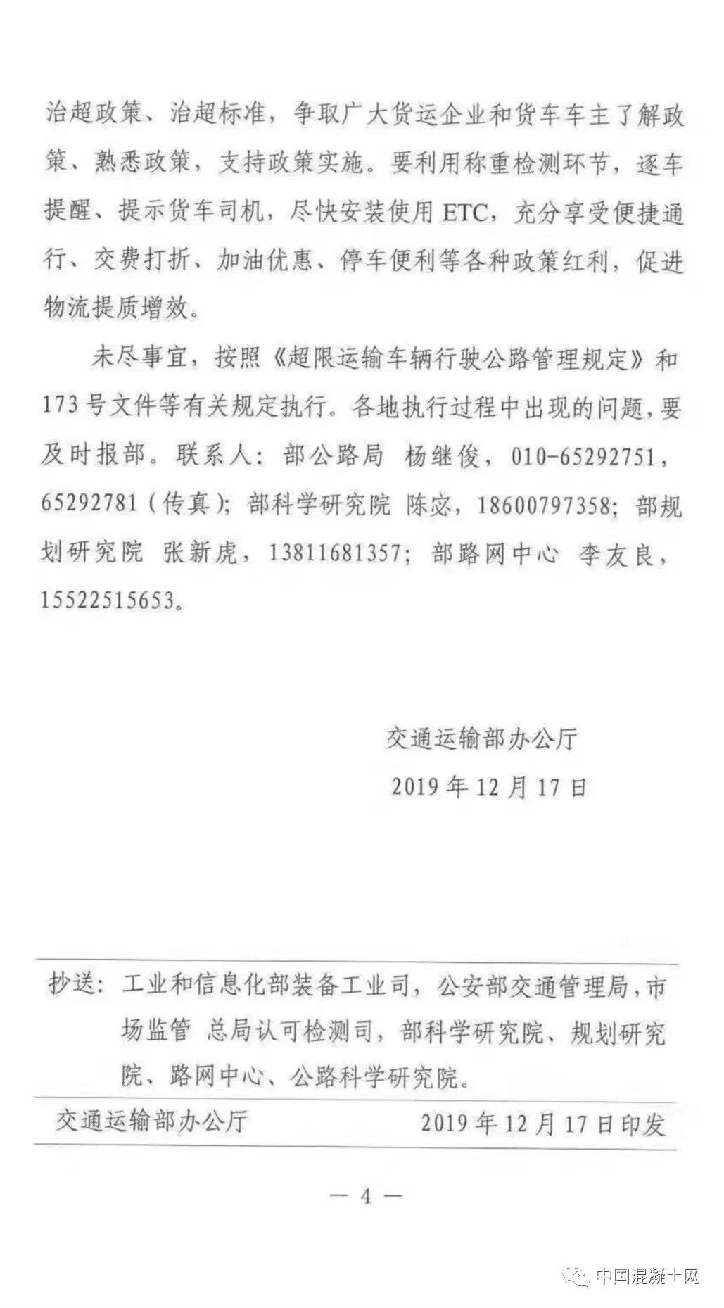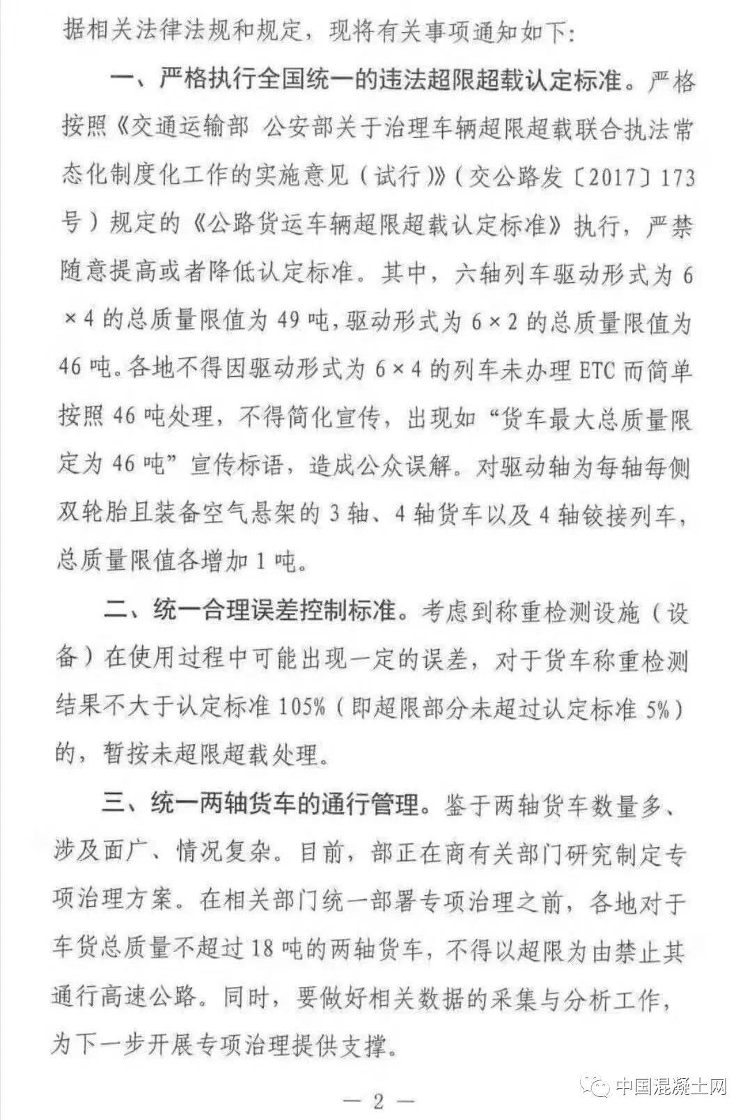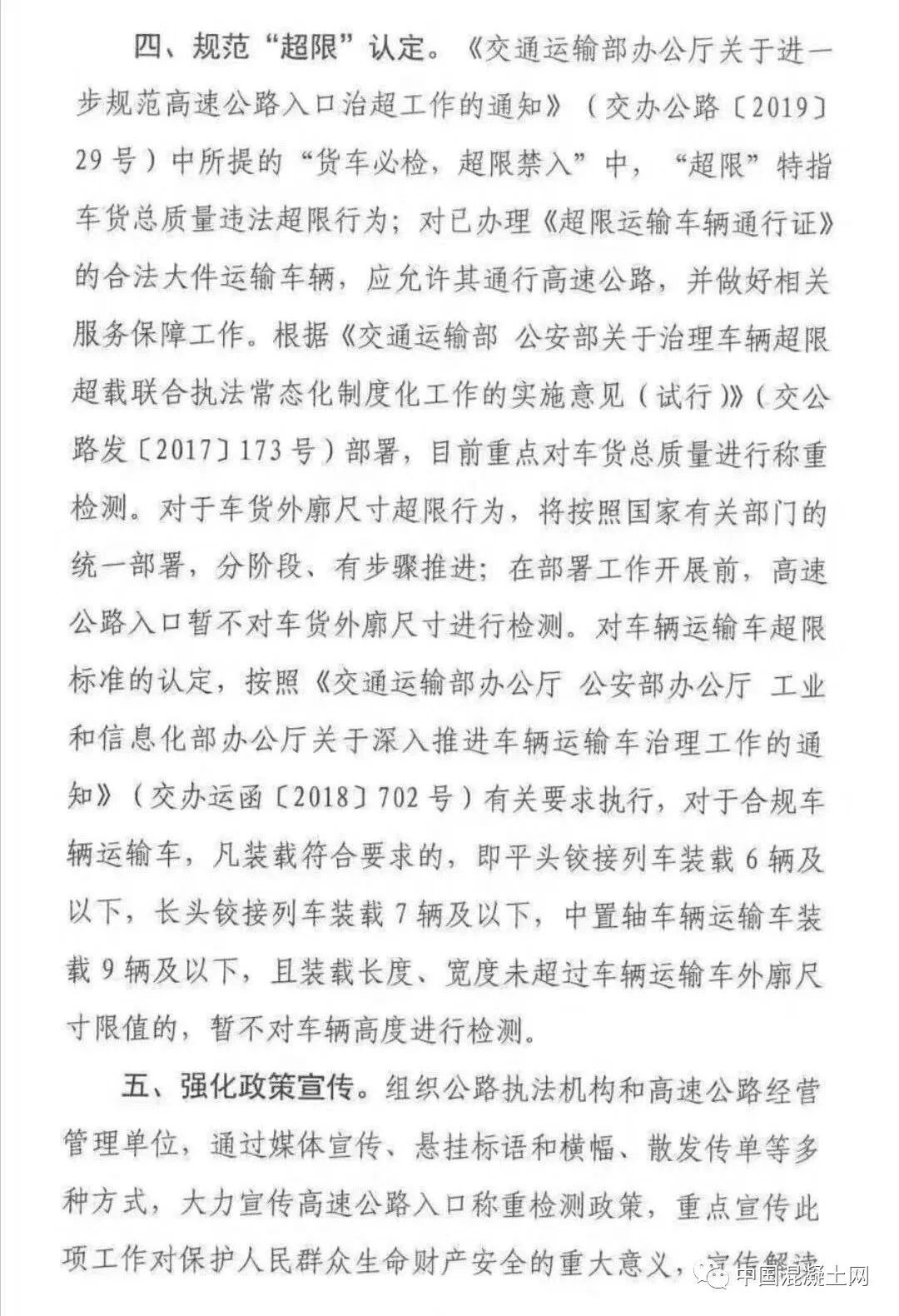 嚴格按照《交通運輸部 公安部關于治理車輛超限超開車聯合執法常態化制度化工作的實施意見 (試行)》(交公路發【2017】173號)規定的《公路貨運車輛超限超載認定標準》執行,嚴禁隨意提高或者降低認定標準。其中,六軸列車驅動形式為6×4的總質量限值為49噸,驅動形式為6×2的總質量限值為46噸。各地不得因驅動形式為6×4人列車未辦理ETC而簡單按照46噸處理,不得簡化宣傳,出現如“貨車最大總質量限定為46噸”宣傳標語,造成公眾誤解。對驅動軸為每軸每則雙輪胎且裝備空氣懸架的3軸、車軸貨車以及4軸鉸接列車總質量限值各增加1噸。考慮到稱重檢測設施(設備)在使用過程中可能出現一定的誤差,對于貨車稱重檢測結果不大于認定標準105%(即超限部分未直如過認定標準的5%)的,暫按未超限超載處理。鑒于兩軸貨車數量多、涉及面廣、情況復雜。目前,部正在商有關部門研究制定專項治理方案。在相關部門統一部署專項治理之前,各地對于車貨總質量不超過18噸的兩軸貨車,不得以超限為由禁止其通行高速公路。同時,要做好相關數據的采集與分析工作,為下一步開展專項治理提供支撐。《交通運輸部辦公室廳關于進一步規范高速公路入口治超工作的通知》(交辦公路【2019】29號)中所提的“貨車必檢,超限禁入”中,“超限”特指車貨總質量違法超限行為;對已辦理《超限運輸車輛通行證》的合法大件運輸致車輛,應允許其通行高速公路,并做好相關服務保障工作。根據《交通運輸部 公安部關于治理車輛超限超載聯合執法常態化制度化工作的實施意見(試行)》(交公路發【2017】173號)部署,目前重點對車貨總質量進行稱重檢測。對于車貨外廓尺寸超限行為,將按照國家有關部門的統一部署,分階段、有步驟推進;在部署工作開展前,高速公路入口暫不對車貨外廓尺寸進行檢測。對車輛運輸超限標準的認定,按照《交通運輸 部辦公室廳 公安部辦公室廳 工業和信息化部辦公室廳關于深入推進車輛運輸車治理工作的通知》(交辦運【2018】702號)有關要求執行,對于合規車輛運輸車,凡裝載符合要求的,即平頭鉸接列車裝載6輛及以下,長頭鉸接列車裝載7輛及以下,中置軸車輛運輸車裝載9輛及以下,且裝載長度、寬度未超過車輛運輸車外廓尺寸限值的,暫不對車輛高度進行檢測。組織公路執法機構和高速公路經營管理單位,通過媒體宣傳、懸掛標語和橫幅、散發傳單等多種方式,大力宣傳高速公路入口稱重檢測政策,重點宣傳此項工作對保護 人民群眾生命財產安全的重大意義 ,宣傳解讀治超政策、治超標準,爭取廣大貨運企業和貨車車主了解政策、熟悉政策,支持政策實施。要利用稱重檢測環節,逐車提醒、提示貨車司機,盡快安裝ETC,充分享受便捷通行、交費打折、加油優惠、車便利等各種政策紅利,促進物流提質增效。未盡事宜,按照《超限運輸車輛行駛公路管理規定》和173號文件等有關規定執行。各地執行過程中出現的要及時報部。全國物流標準非?;靵y,地方標準與國家標準經?!按蚣堋?,導致全國物流司機苦不堪言,而此次交通廳像各省運輸廳發布特急文件通知,劍指就是統一運輸車輛載重的標準,令運輸行業向制度化,規范化過渡。同時從根源上徹底清除“亂收費”現象,并發布問題反映電話: