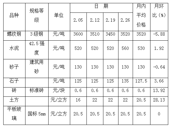 受春節假期和新冠肺炎疫情影響,2月份山東省濟寧市黃河灘區遷建物資市場交易量明顯減少,價格變動整體漲跌互現。與上月相比,7種黃河灘遷建物資價格呈4升2降1平態勢。其中,螺紋鋼的價格震蕩下行,水泥的價格穩中有漲,砂子、磚和平板玻璃的價格月內平穩運行,石子的價格受季節性供應減少影響小幅上升,土方的價格呈現高位整理態勢。螺紋鋼方面,截止到2月26日,濟寧市梁山縣監測的螺紋鋼市場批發價格為3520元/噸,價格下降明顯。由于目前特殊時期,貨運受阻且下游企業復工進度開展緩慢,短期內需求仍然偏弱,市場整體成交冷清,庫存和資金壓力逐步增加,供給壓力放大,商家對于后市心態偏空,處于悲觀情緒,市場整體處于有價無市狀態。