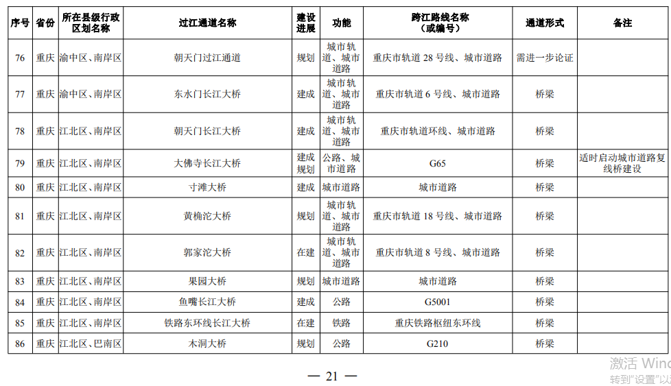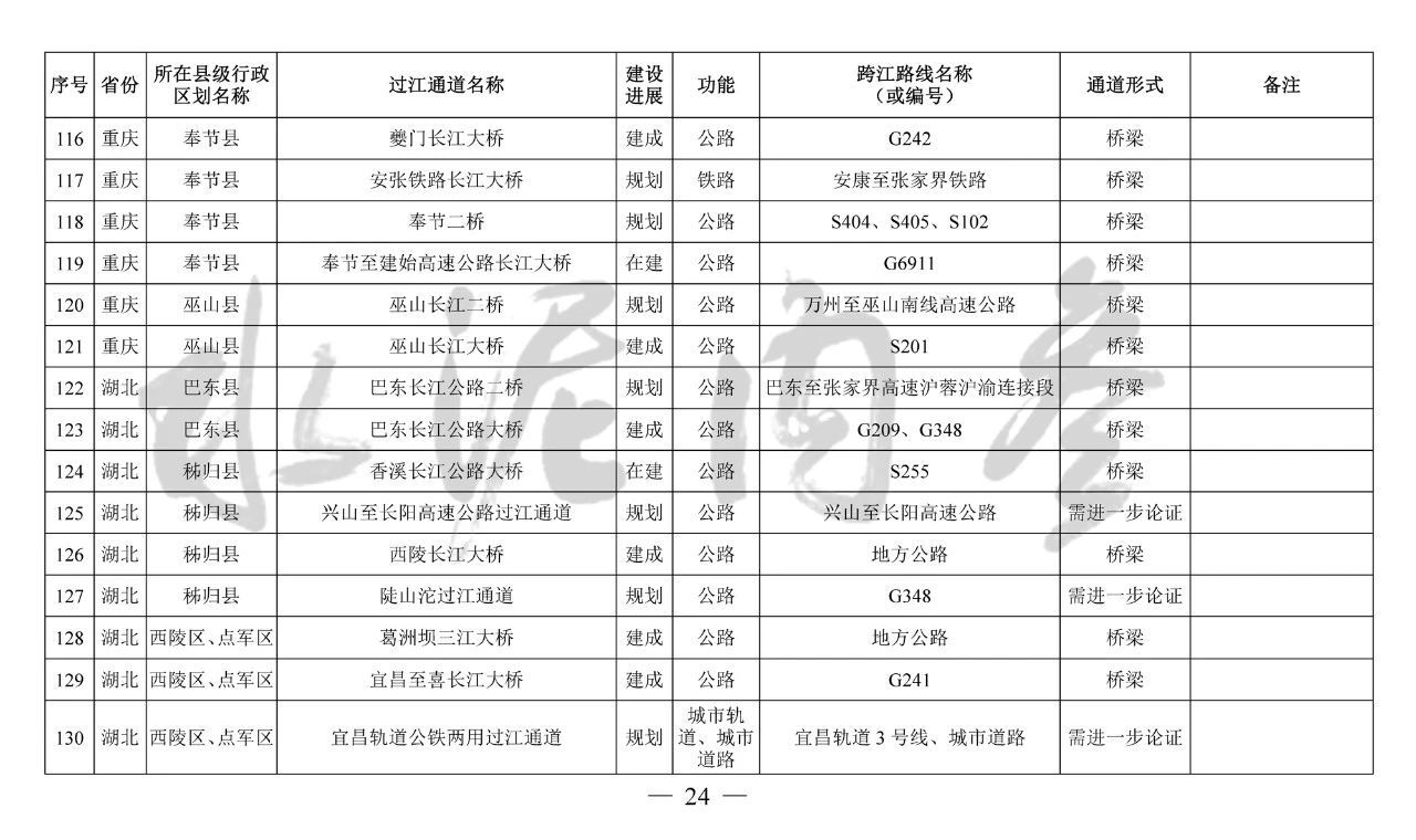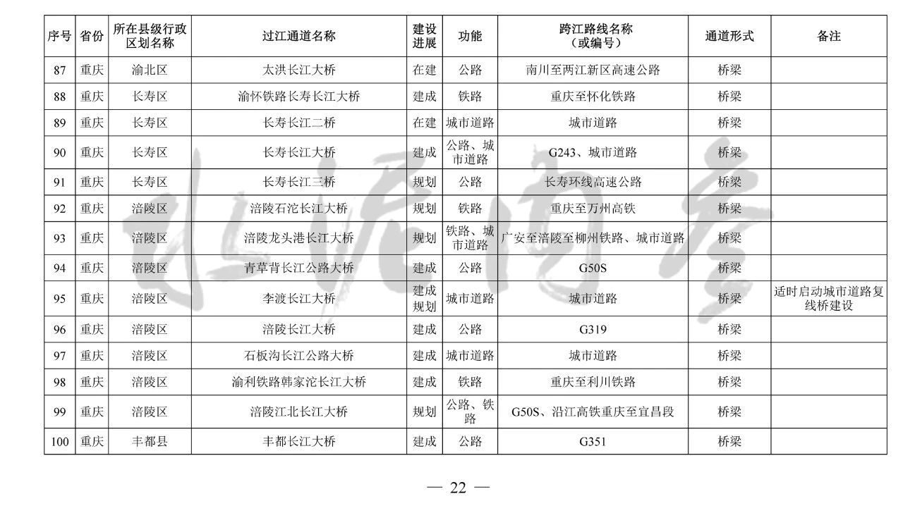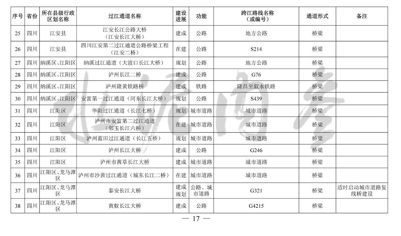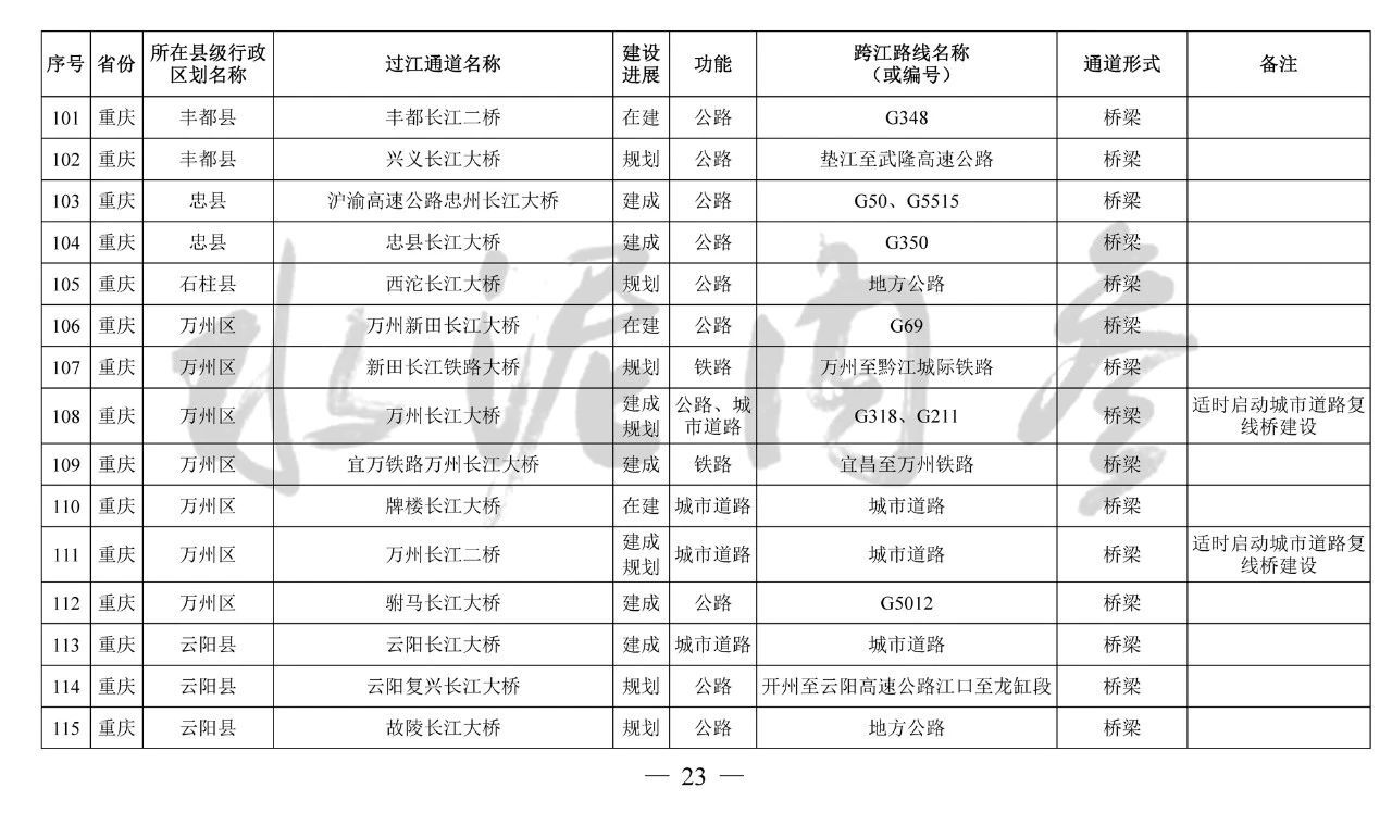 重慶市(17座):市域(郊)鐵路跳蹬至江津線長江大橋、西彭長江大橋(支坪長江大橋)、小南海長江大橋、中壩過江通道、黃桷坪長江大橋、軌道27號線過江通道、重慶至黔江鐵路過江通道、黃桷沱大橋、長壽長江三橋、涪陵石沱長江大橋、涪陵龍頭港長江大橋、涪陵江北長江大橋、興義長江大橋、西沱長江大橋、云陽復興長江大橋、奉節二橋、巫山長江二橋