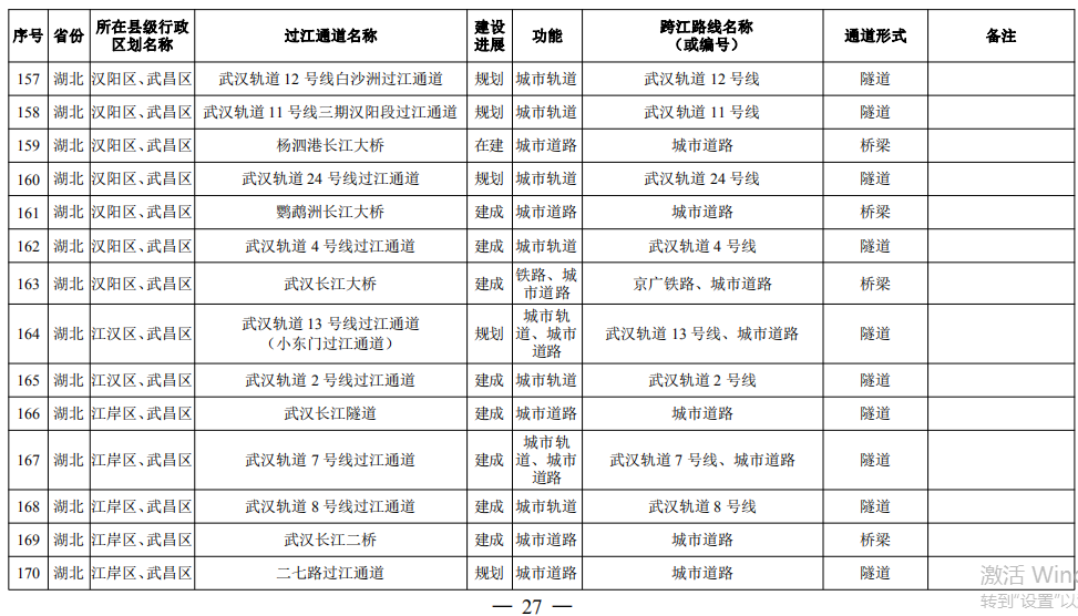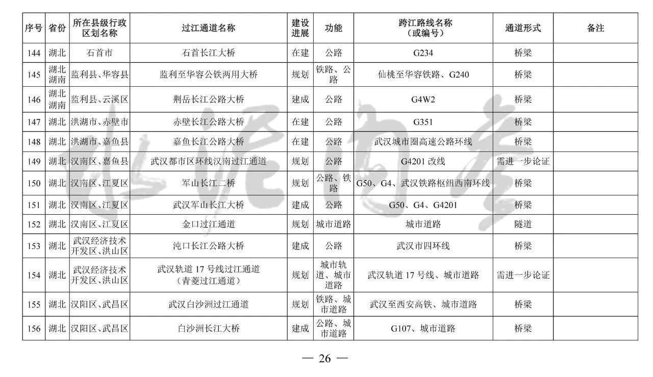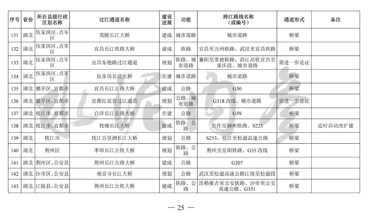湖北省(24座):巴東長江公路二橋、興山至長陽高速公路過江通道、宜昌東艷路過江通道、宜都紅花套過江通道、枝江百里洲長江大橋、李埠長江公鐵大橋、觀音寺長江大橋、武漢都市區環線漢南過江通道、軍山長江二橋、武漢軌道17號線過江通道(青菱過江通道)、武漢白沙洲過江通道、武漢軌道12號線白沙洲過江通道、武漢軌道11號線三期漢陽段過江通道、武漢軌道13號線過江通道(小東門過江通道)、二七路過江通道、武漢軌道10號線二七過江通道、武漢軌道12號線丹水池過江通道、堤角過江通道、武漢軌道20號線過江通道、武漢軌道25號線過江通道(長江新城過江通道)、武漢軌道新港線陽邏過江通道、光谷過江通道、新港高速雙柳長江大橋、鄂黃第二過江通道鄂湘界(1座):監利至華容公鐵兩用大橋