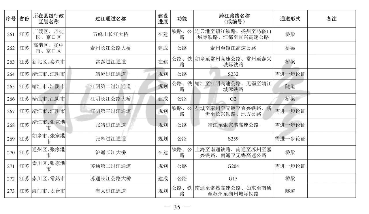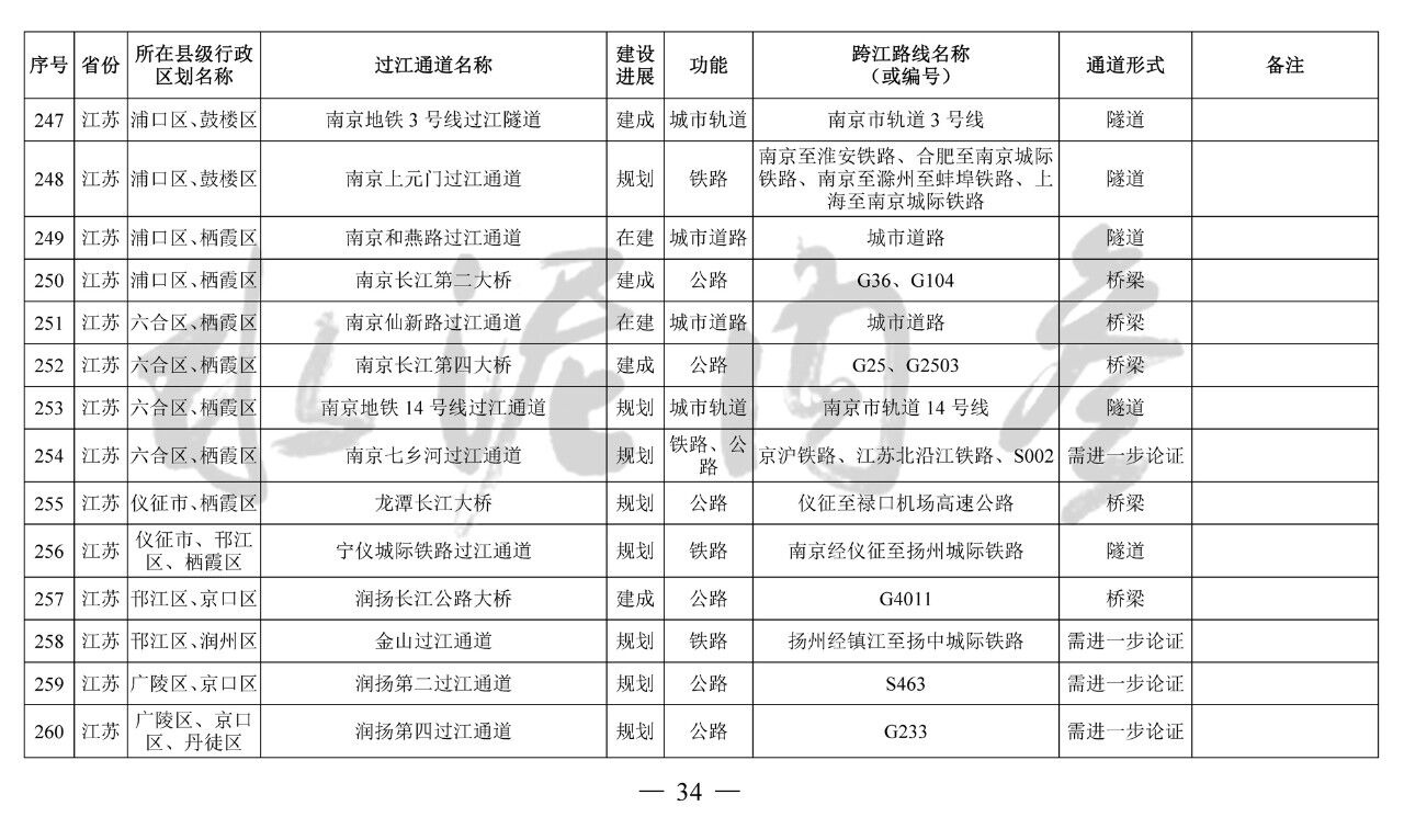 江蘇省(13座):錦文路過江通道、南京地鐵4號線過江通道、南京市域快速軌道過江通道、南京上元門過江通道、南京七鄉河過江通道、龍潭長江大橋、寧儀城際鐵路過江通道、潤揚第二過江通道、江陰第二過江通道、江陰第三過江通道、張皋過江通道、蘇通第二過江通道、海太過江通道