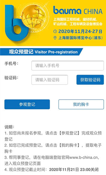 掃碼進(jìn)入預(yù)登記頁面,或登錄官網(wǎng)www.b-china.cn。中國港澳臺地區(qū)與海外觀眾,請登陸英文網(wǎng)站www.bauma-china.com進(jìn)行預(yù)登記。