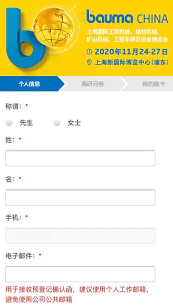 請按提示完整填寫您的個(gè)人信息。為方便您后期接受預(yù)登記確認(rèn)函、為同事注冊,請務(wù)必確認(rèn)手機(jī)、郵箱、姓名準(zhǔn)確填寫。
