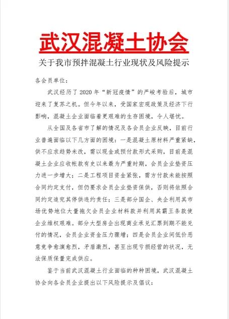 鑒于當前武漢混凝土行業面臨的種種困境,武漢混凝土協會向各會員企業提出以下風險提示及倡議∶