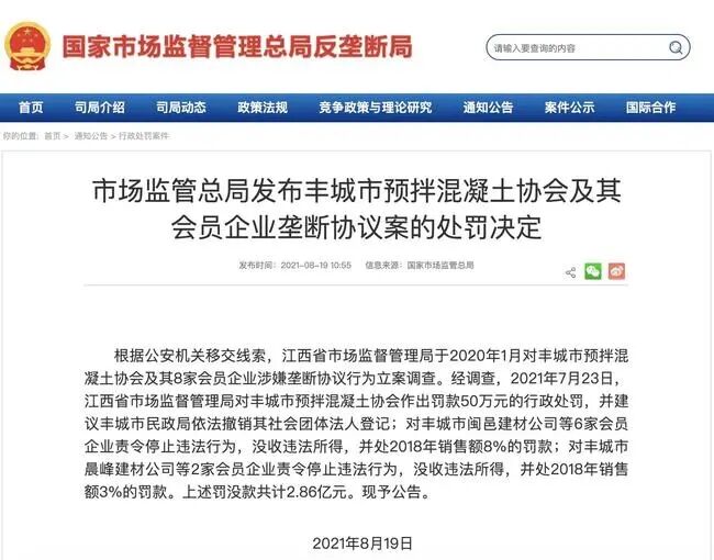 8月18日,國家市場監管總局發布通報,江西省市場監督管理局對豐城市預拌混凝土協會及其會員企業壟斷協議一案,合計罰沒約2.86億元。