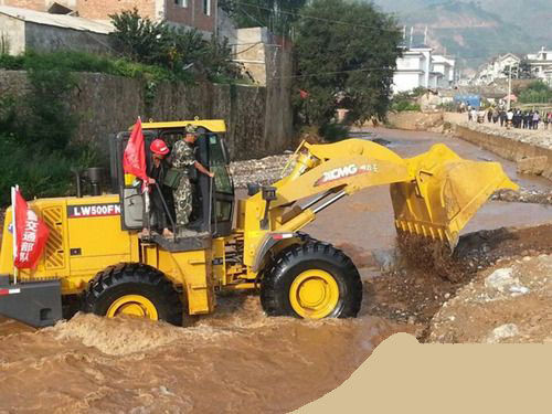徐工救援隊員早已為車輛做好了一切前期準備,按照指揮部安排,此臺徐工LW500FN裝載機參與清理災區因塌方被堵塞的河道,并在河道中進行鋪設快速通道工作,從河道中央開出一條水上救援之路。至上午11點,徐工裝載機高效出色地順利完成了任務,不僅排除了水災隱患,更在河道中修出一條“生命線”,使后續救護車、武警車等救援車輛可以通過這條簡易通道直抵震中,為被困被埋群眾在72小時黃金救援時間內獲救爭取到了更多時間。