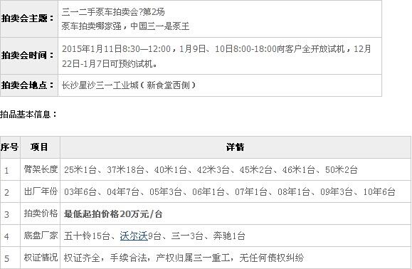 本次拍賣只限31臺精品二手泵車,臂架長度范圍37米-62米,出廠年份范圍2014年-2003年。拍賣價格最低每臺20萬元。權證齊全,手續合法,產權歸屬三一重工,無任何債權糾紛。歡迎廣大客戶朋友前來競拍。對于競拍客戶報名超過10人的省份,公司將在當地三一6S店或產業園開設網絡分會場,不用到長沙也可遠程參與拍賣!省時省力省心!