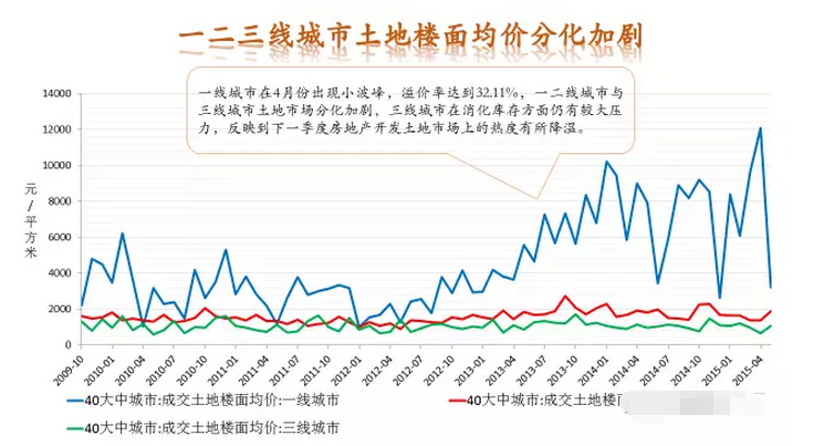 從不同級別的城市看,一線城市環比3月上漲幅度達到14.1%,漲幅最大,二線城市漲幅也達到7.3%。而三四線城市則并不樂觀,整體市場走勢出現了明顯的分化趨勢。