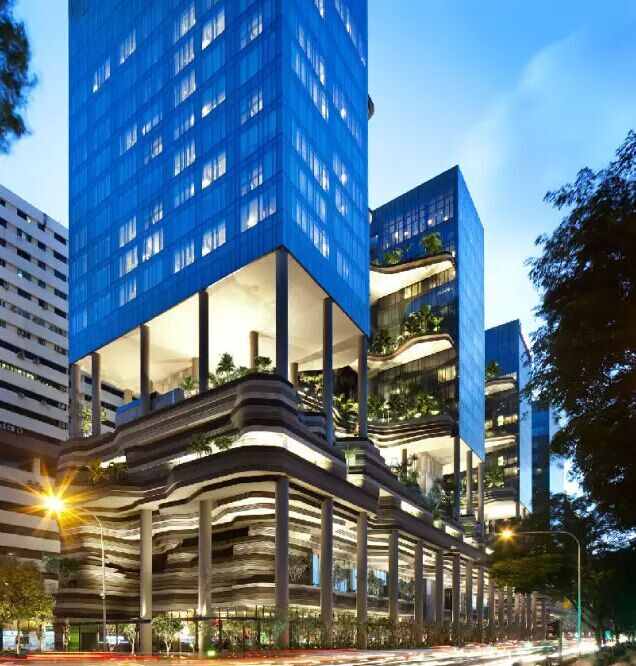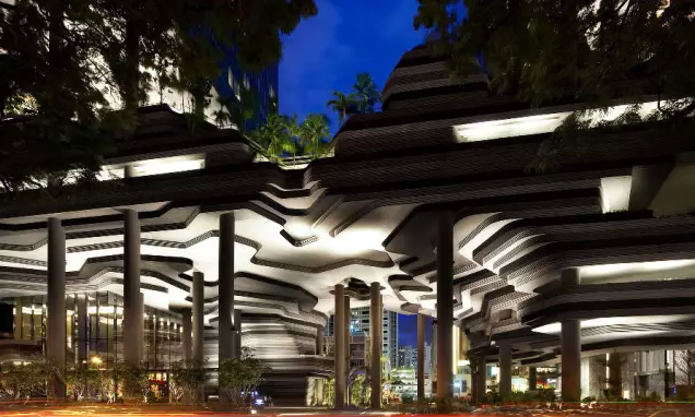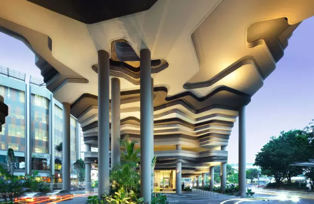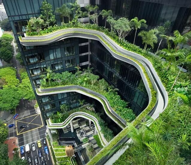 建筑流動的幾何體給人一種高聳入云之感,塔樓每隔三層客房擁有懸挑的空中花園,上面種滿了熱帶植物,它已成為城市綠地的一部分,與鄰近公園融為一體。酒店擁有自我遮陽功能,懸挑而出的空中花園和相鄰的三座酒店客房大樓都能起到遮陽的作用,客房樓層立面采用低輻射玻璃。酒店頂樓的屋頂花園可將全城風光一覽無余,獨家蘭花貴賓會所位處該層,并配有私人會議空間、圖書館和專用的貴賓會所門房。酒店五層設有可俯瞰城市的無邊界泳池,設備先進的健身中心,特色的鳥籠休息涼亭及長達300米花園走道。