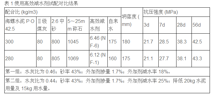 試配對比結果分析:其他材料相同,使用高效減水劑(NF-1),保持砂率及外加劑摻量不變,適當降低水泥用量及用水量,使水灰比降低,在相同的坍落度下28d 及 56d 強度相近并降低了成本。