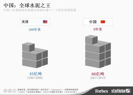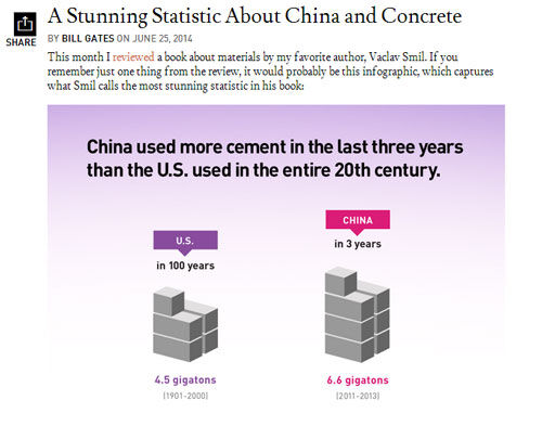 比爾·蓋茨做了一個令人震撼的對比,讓大家對中國在二十一世紀對水泥的狼吞虎咽有一個直觀認識。比爾·蓋茨在個人博客上表示,2011年至2013年期間,中國消耗了66億噸水泥,超過美國在整個二十世紀的消耗量。但是看看美國在1901年至2000年期間建造了哪些工程:各種摩天大樓、州際公路、胡佛水壩等等,而期間消耗的水泥總共只有45億噸。不過,蓋茨沒有能夠呈現中美兩國地理環境、建筑習慣的差異,因而有些大驚小怪。