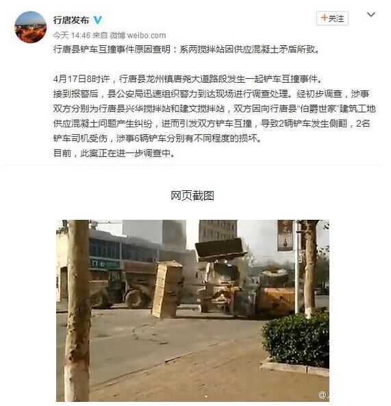 17日8時許,行唐縣發生鏟車互撞事件。經警方初步調查,涉事雙方為行唐縣兩攪拌站,因向某建筑工地供應混凝土問題產生糾紛,進而沖突。致2輛鏟車發生側翻,2名鏟車司機受傷,涉事6輛鏟車分別有不同程度的損壞。該案還在進一步調查中。