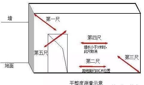 三、表面平整度1、指標說明:反映層高范圍內剪力墻、混凝土柱表面平整程度。2、測量工具:2米靠尺、楔形塞尺3、測量方法和數據記錄:(1)剪力墻/暗柱:選取長邊墻,任選長邊墻兩面中的一面作為1個實測區。累計實測實量不少于5個實測區。(2)當所選墻長度小于3米時,同一面墻4個角(頂部及根部)中取左上及右下2個角。按45度角斜放靠尺,累計測2次表面平整度。跨洞口部位必測。這2個實測值分別作為該指標合格率的2個計算點。(3)當所選墻長度大于3米時,除按45度角斜放靠尺測量兩次表面平整度外,還需在墻長度中間水平放靠尺測量1次表面平整度。跨洞口部位必測。這3個實測值分別作為判斷該指標合格率的3個計算點。(4)混凝土柱:可以不測表面平整度。4、示例: