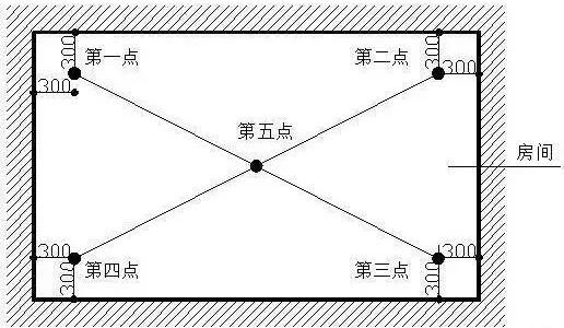 五、頂板水平度極差1、指標說明:考慮實際測量的可操作性,選取同一功能房間混凝土頂板內四個角點和一個中點距離同一水平基準線之間5個實測值的極差值,綜合反映同一房間混凝土頂板的平整程度。2、測量工具:激光掃平儀、具有足夠剛度的5米鋼卷尺(或2米靠尺、激光測距儀)3、測量方法和數據記錄:(1)同一功能房間混凝土頂板作為1個實測區,累計實測實量不得少于3個實測區。(2)使用激光掃平儀,在實測板跨內打出一條水平基準線。同一實測區距頂板天花線約30cm處位置選取4個角點,以及板跨幾何中心位(若板單側跨度較大可在中心部位增加1個測點),分別測量混凝土頂板與水平基準線之間的5個垂直距離。以最低點為基準點,計算另外四點與最低點之間的偏差。最大偏差值≤15mm時,5個偏差值(基準點偏差值以0計)的實際值作為判斷該實測指標合格率的5個計算點。最大偏差值﹥15mm時,5個偏差值均按最大偏差值計,作為判斷該實測指標合格率的5個計算點。4、示例: