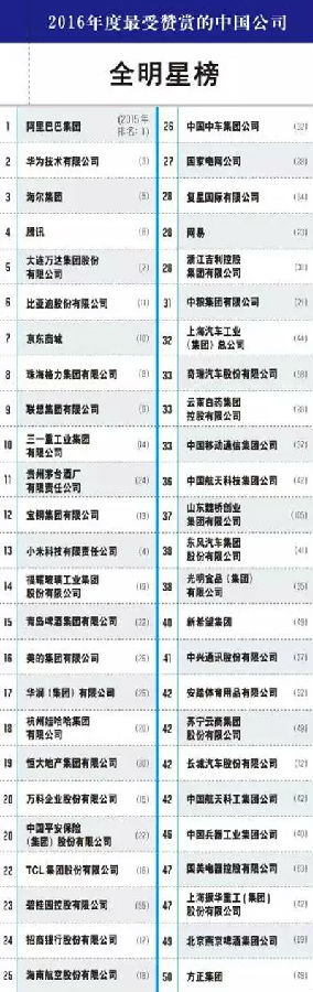 這份榜單一向被認為是中國公司軟實力的晴雨表,今年的排行榜由《財富》(中文版)通過網絡向35000名中國企業管理人發放問卷調查得出。調查評分標準主要包括產品和服務地位、長期投資價值、公司資產合理利用、創新能力、管理質量、財務穩健程度、吸引和保留人才的能力、社會責任、全球化經營的有效性9個方面,綜合得分最高的50家公司榮登“最受贊賞的中國公司”全明星榜。