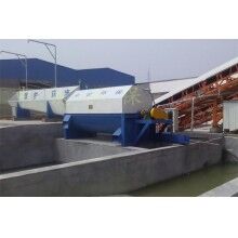 該系統主要由:攪拌車加水清洗裝置,溜槽輸送裝置,砂石漿水分離裝置,和泥漿水后處理裝置組成。混凝土輸送設備清洗后,將殘余混凝土排入溜槽中,在高壓水流沖擊下,經溜槽進入砂石分離機,在不斷旋轉的分離機作用下,對混凝土進行充分的清洗,同時將砂、石進行分離,分離后的砂、石在導料葉片的作用下背向流動,再通過提升式出料口排出分離機,分別堆放。清洗后的漿水從分離機的底部排出進入沉淀池逐級沉淀后循環使用或進入攪拌池回收利用。進入攪拌池(一般情況2個攪拌池)的漿水為了防止沉淀凝固,需通過攪拌器的作用,攪拌器的工作為間歇式。分離出水泥漿在連續的攪拌器作用下,再通過高壓污水泵輸送到攪拌樓中待生產計量再利用。整個控制系統設有手動和自動控制,方便控制設置,整個系統運行可靠,故障率低,維護量少等特點。