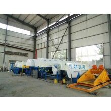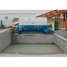 該系統主要由:攪拌車加水清洗裝置,溜槽輸送裝置,砂石漿水分離裝置,和泥漿水后處理裝置組成。混凝土輸送設備清洗后,將殘余混凝土排入溜槽中,在高壓水流沖擊下,經溜槽進入砂石分離機,在不斷旋轉的分離機作用下,對混凝土進行充分的清洗,同時將砂、石進行分離,分離后的砂、石在導料葉片的作用下背向流動,再通過提升式出料口排出分離機,分別堆放。清洗后的漿水從分離機的底部排出進入沉淀池逐級沉淀后循環使用或進入攪拌池回收利用。進入攪拌池(一般情況2個攪拌池)的漿水為了防止沉淀凝固,需通過攪拌器的作用,攪拌器的工作為間歇式。分離出水泥漿在連續的攪拌器作用下,再通過高壓污水泵輸送到攪拌樓中待生產計量再利用。整個控制系統設有手動和自動控制,方便控制設置,整個系統運行可靠,故障率低,維護量少等特點。