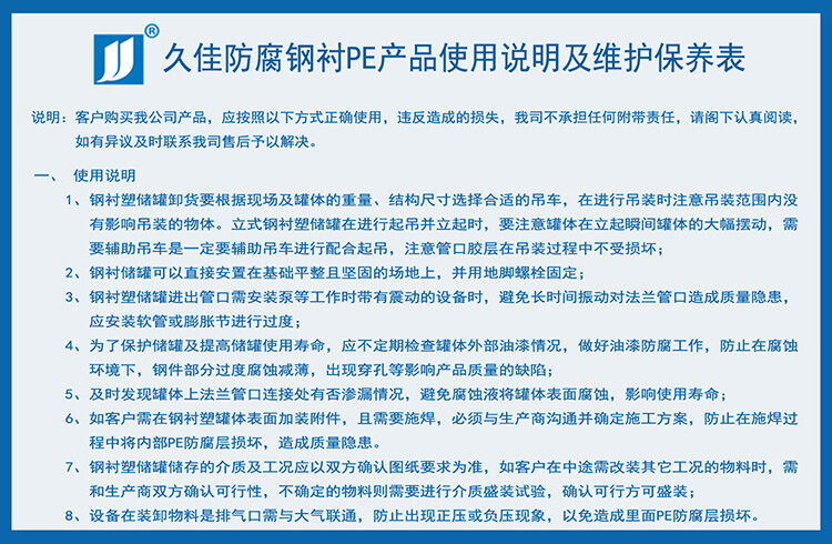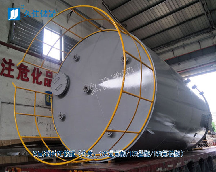 氫氟酸儲罐材質  廣東鋼襯PE氫氟酸儲罐廠家 久佳牌 訂制 鋼襯塑酸堿儲存罐特性:鋼襯塑儲罐由于其獨特的滾塑工藝、產品整體結構和材料優異性能,具有整體性好、強度高、無焊縫、不滲漏、抗沖擊、韌性好、重量輕、壽命長、耐酸堿、耐有機溶媒、符合衛生標準、價格低廉、規格品種多等特點。尤其耐腐蝕、長壽命和大規格品種有非常大的優勢,是貯存和運輸各類化工液體半固體的理想產品。其性能大大超過了傳統的玻璃鋼、陶瓷、橡膠、焊接塑料等材料制作的防腐儲罐。已成為傳統防腐儲罐的升級換代產品,逐漸成為防腐儲罐的首選產品。
