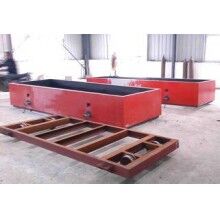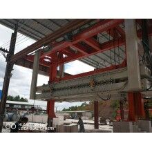 移動式掰板機工作流程:蒸養(yǎng)完成的成品連同模具側板被模具側板運輸裝置送至移動掰板機下,頂升裝置啟動,將坯體連同側板頂起,移動掰板機從上層至下層依次掰開,掰至底層后,移動掰板機將全部成品夾起,并移至砌塊成品打包線上,將砌塊放置在該打包線上,移動掰板機繼續(xù)將加氣板移動至加氣板輸送打包線上,重新返回。掰扳機專門負責坯體切開之后(經(jīng)蒸養(yǎng))又重新粘連在一起,在自動打包之前將其一塊一塊分離,消除由于粘連造成的廢、次品,同時保證打包線正常運行。