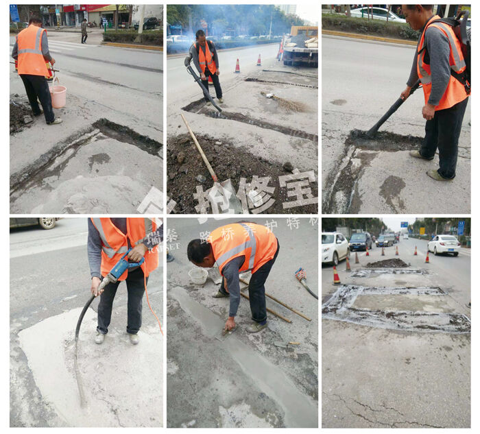 以使用搶修寶水泥路面修補料RT-2為例來說明。使用搶修寶水泥混凝土路面修補料修補病害非常簡單,首先在修補前,一定要對水泥混凝土路面坑槽進行清理,然后再用高壓水槍沖刷干凈,沖刷后用風槍將明水吹干,保持濕潤狀態;隨后根據坑槽的深淺,按施工比例充分攪拌修補料,攪拌后攤鋪于坑槽部位收光養護即可。搶修寶水泥路面修補料的粘結力表現、抗壓耐磨表現、無收縮無老化表現均良好,修補后材料不易脫落不易老化,使用壽命長,可以一次性修復水泥混凝土路面坑槽病害,恢復路面美觀及功能。