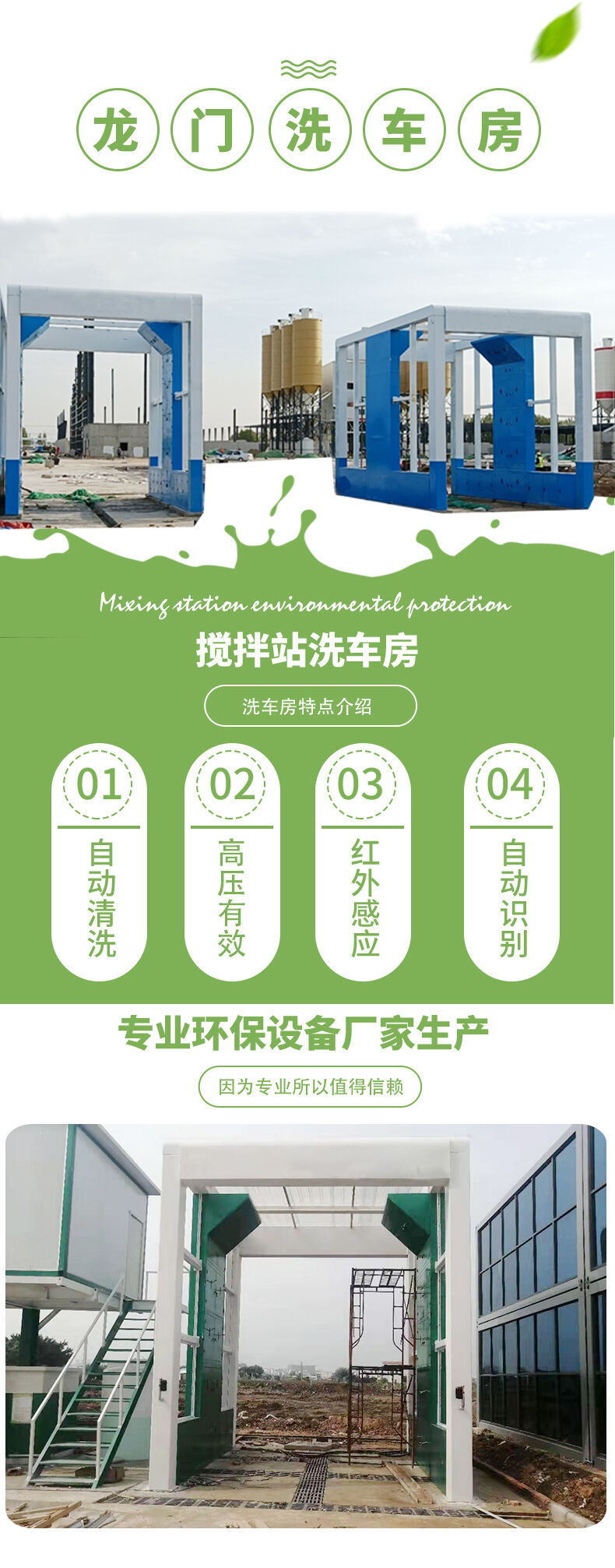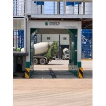針對混凝土攪拌站研發的固定式工程車輛洗車房,其主要作用是清洗攪拌罐車進料口、車輪、底盤及車身,通過高壓噴頭沖洗可以有效去除清洗部位的泥土灰塵以及未凝固的水泥漿,避免了攪拌車身殘留混凝土四處散落對環境的 影響。